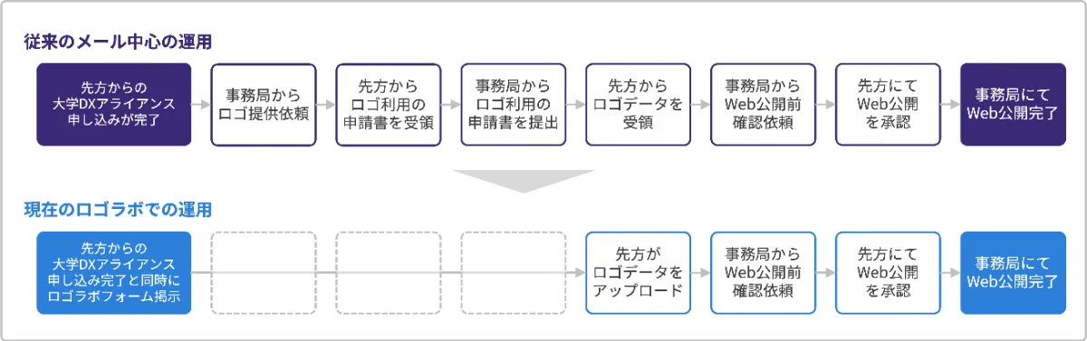 実は、大学DXアライアンスでは新規参画プロセスそのものが複雑になっており、ロゴ受領以外にも「規約内容の送付・確認」「ウェブサイトへのお知らせ掲載」「担当者同士の連絡」などのタスクが混在していました。そこで、ロゴラボ導入を機に、全体の業務フローを洗い出し、どのタイミングで何を行うかを見直す作業を並行して進めました。山﨑さまによると、「システムを入れただけで終わるのではなく、属人化を避けるためにも運用をどれだけシンプルにするかに拘って業務フローを設計していきました。」と言います